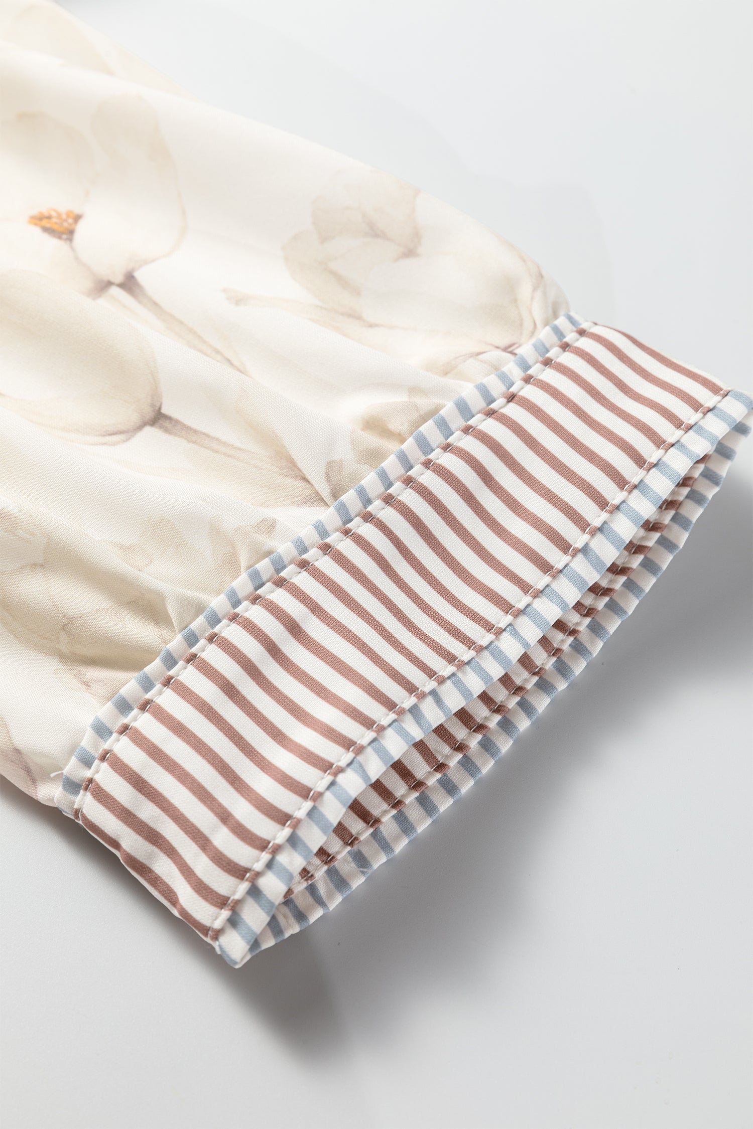 Features a delicate floral print, cuffed ¾ sleeves ruffle hem and a contrast striped accent.